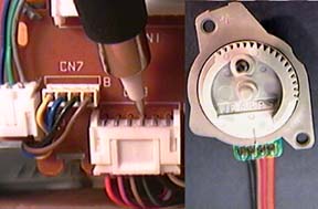 Connect the Ground lead of the probe to the chassis and carefully place the probe tip on the exposed metal of the connector.  In Figure One, the Mode switch leads are the Black, Brown, Red and Orange wires of CN-8 (the legend is obscured by the probe).  The Load switch leads are Yellow, Blue, Brown and Black.  Cycle the transport by starting with no tape, then cycle through all of its mechanical states (Play, Fast Wind, Search, etc).  Loud clear "pops" are good.  Grunge is bad.